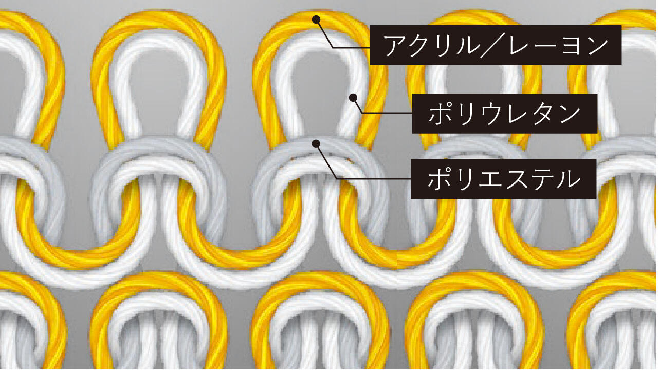 さらにポリウレタンがゴムのように伸縮し、しなやかなストレッチ性を実現。そしてポリエステルが水分を素早く吸収・拡散させることで、汗をかいても快適なさらっとした肌触りを生み出しているのです。