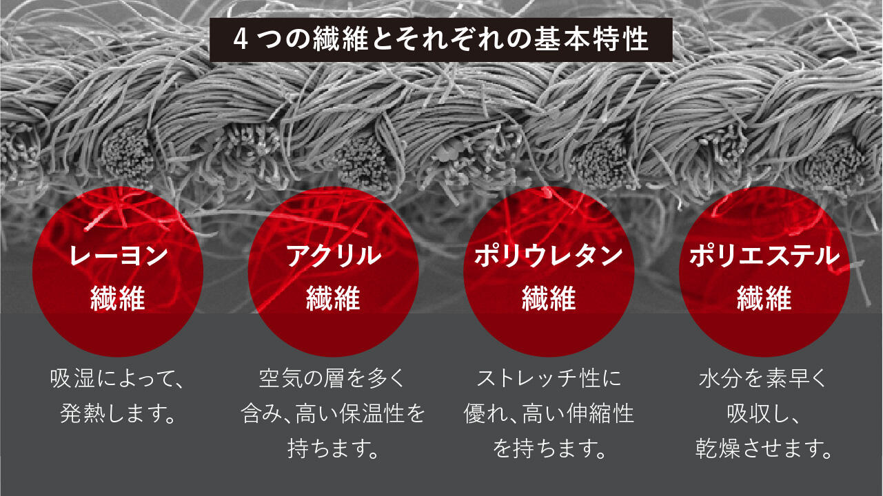 「薄くて軽いのに暖かい」ヒートテックの秘密は、4種類の繊維それぞれの特性を組み合わせたことにあります。 レーヨンが体から常時発散される水分をキャッチし、その運動エネルギーを熱に変換。