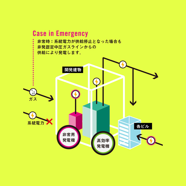 「日本橋室町三丁目地区市街地再開発計画」では、都市ガスを燃料とした高効率発電機(ガスコジェネレーションシステム)を導入。災害時に万が一、電力の供給が停止した場合にもガスラインからの供給により発電し、オフィスビルだけでなく周辺エリアにも「電気」と「熱」を供給します。