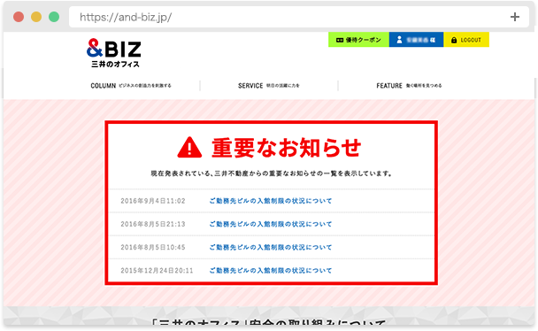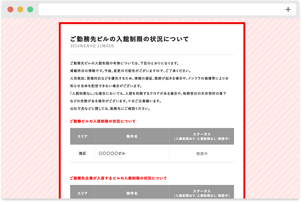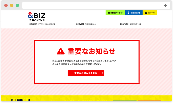 ※入居されているビルによっては、「緊急時の重要なお知らせ」が表示されない場合があります。ご了承ください。