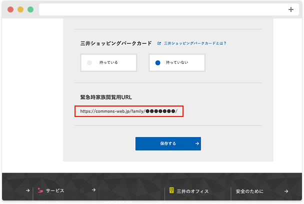 - 「MYPAGE」→「アカウント設定」を開き、「緊急時家族閲覧用URL」をご確認のうえ、家族の方に事前にお伝えください。