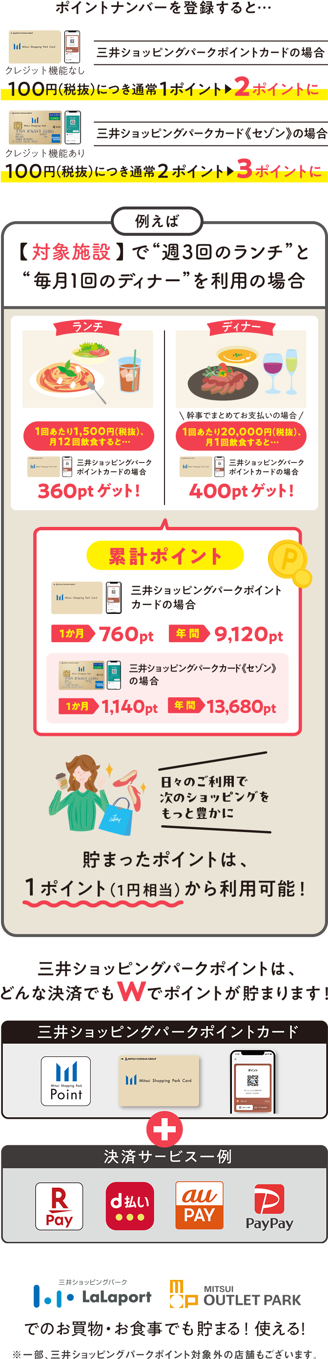ららぽーとや三井アウトレットパーク、&mall/三井アウトレットパークオンラインなど、全国60以上の施設でたまる・つかえる、便利なポイントです。