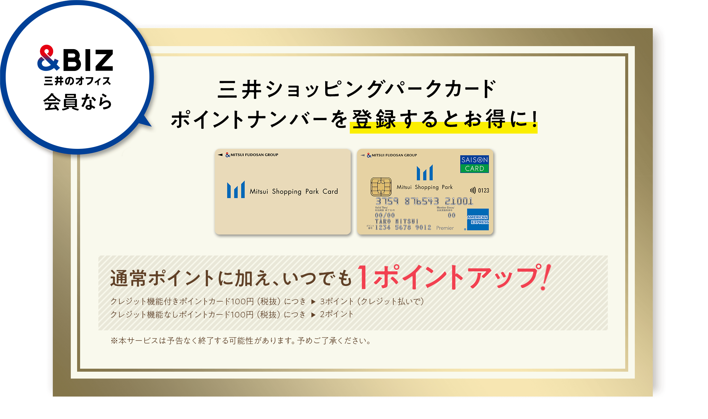 ※&BIZ会員向けのボーナスポイントは、&BIZ会員サイトにて会員登録後、三井ショッピングパークポイントとの登録手続きを完了した方のみが対象となります。